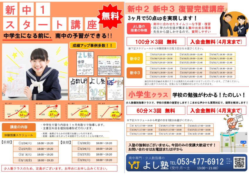 浜松市中央区にある小学生・中学生・高校生対象の少人数指導&南部中学生専門の塾です。
